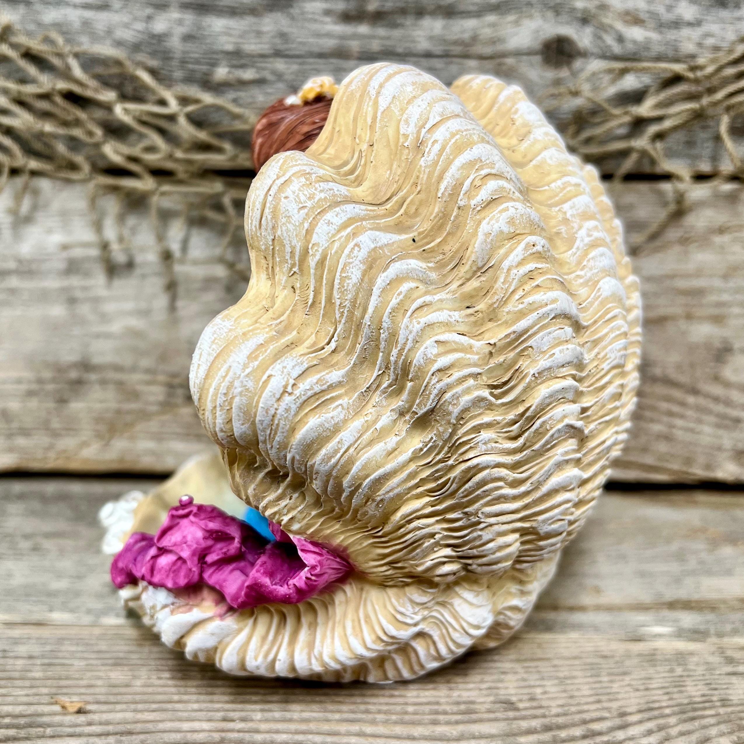 5” H x 5” W x 4” D Resin Mermaid with Blue Tail Resting On Pearl Inside Giant Clam Shell Tabletop Statuette