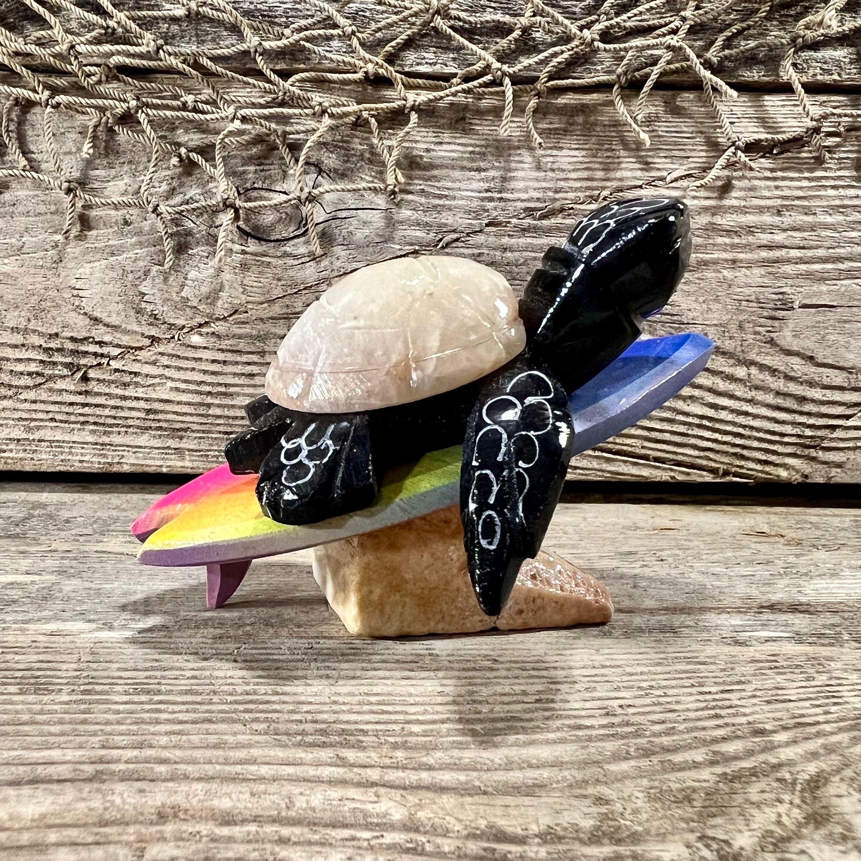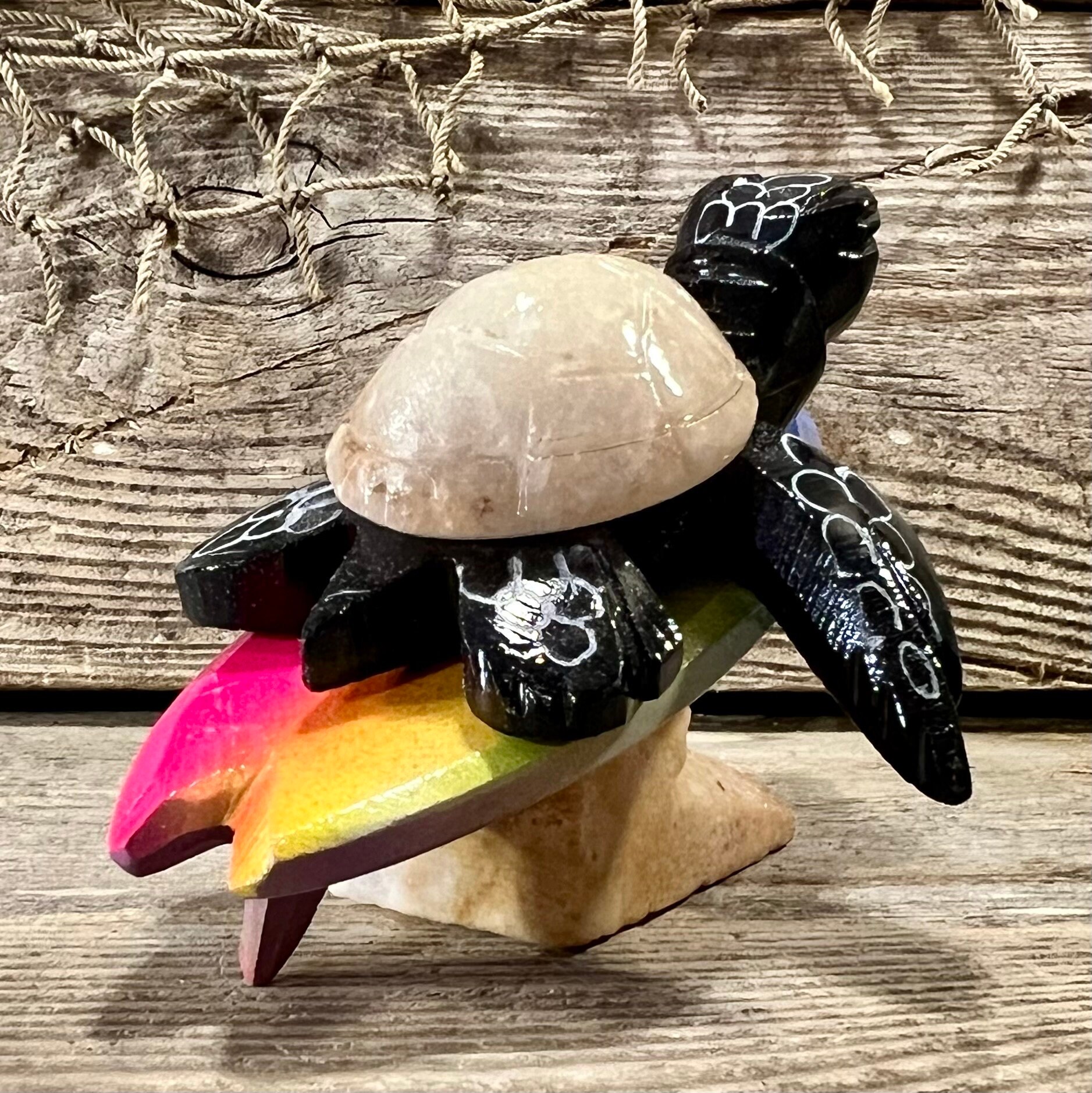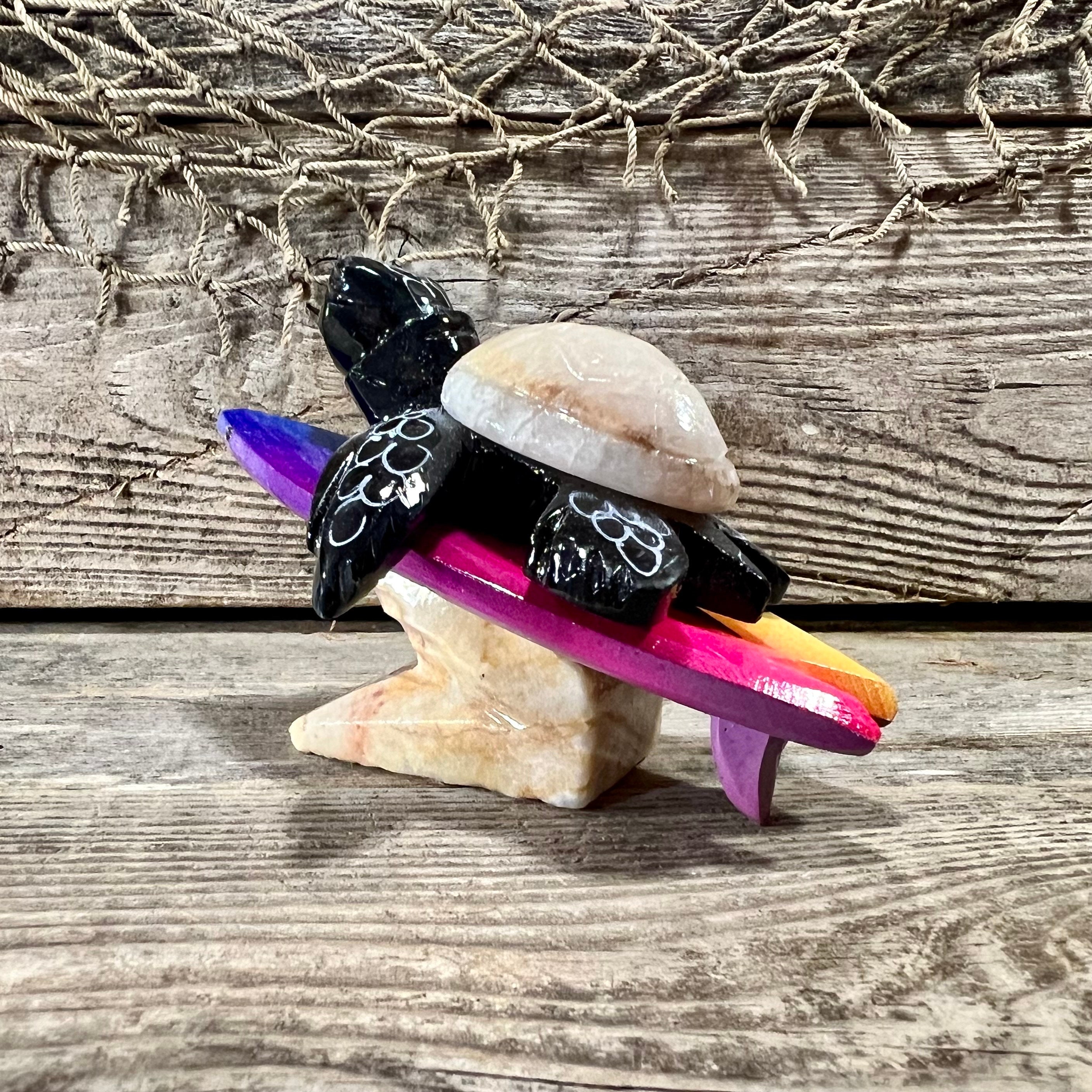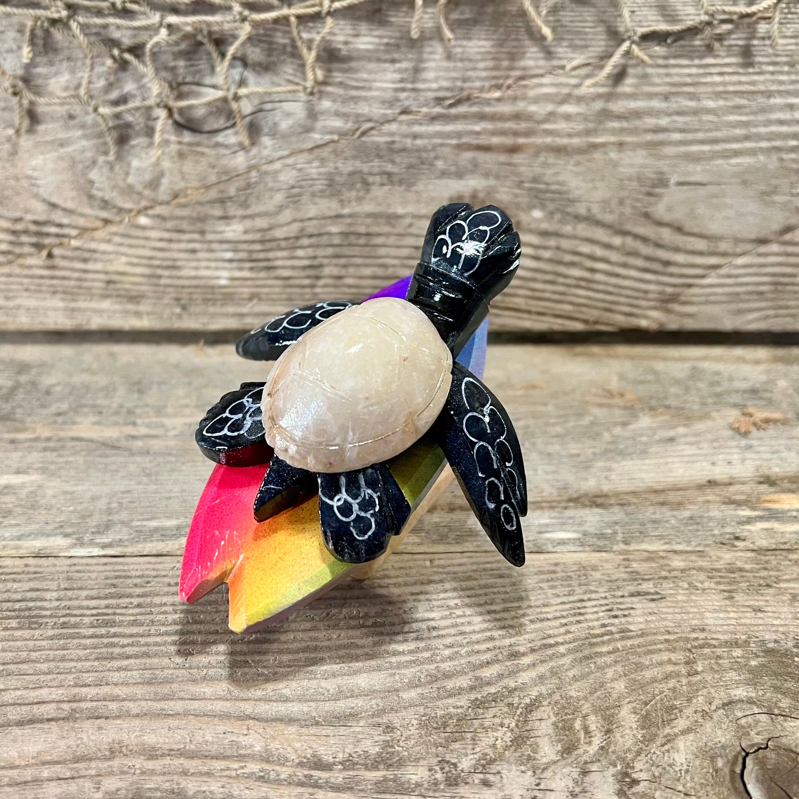 3 3/4” L x 2 1/4” H x 3” W Handcrafted Marble Surfing Black Sea Turtle with Beige Shell Riding Rainbow Surfboard Tabletop Figurine