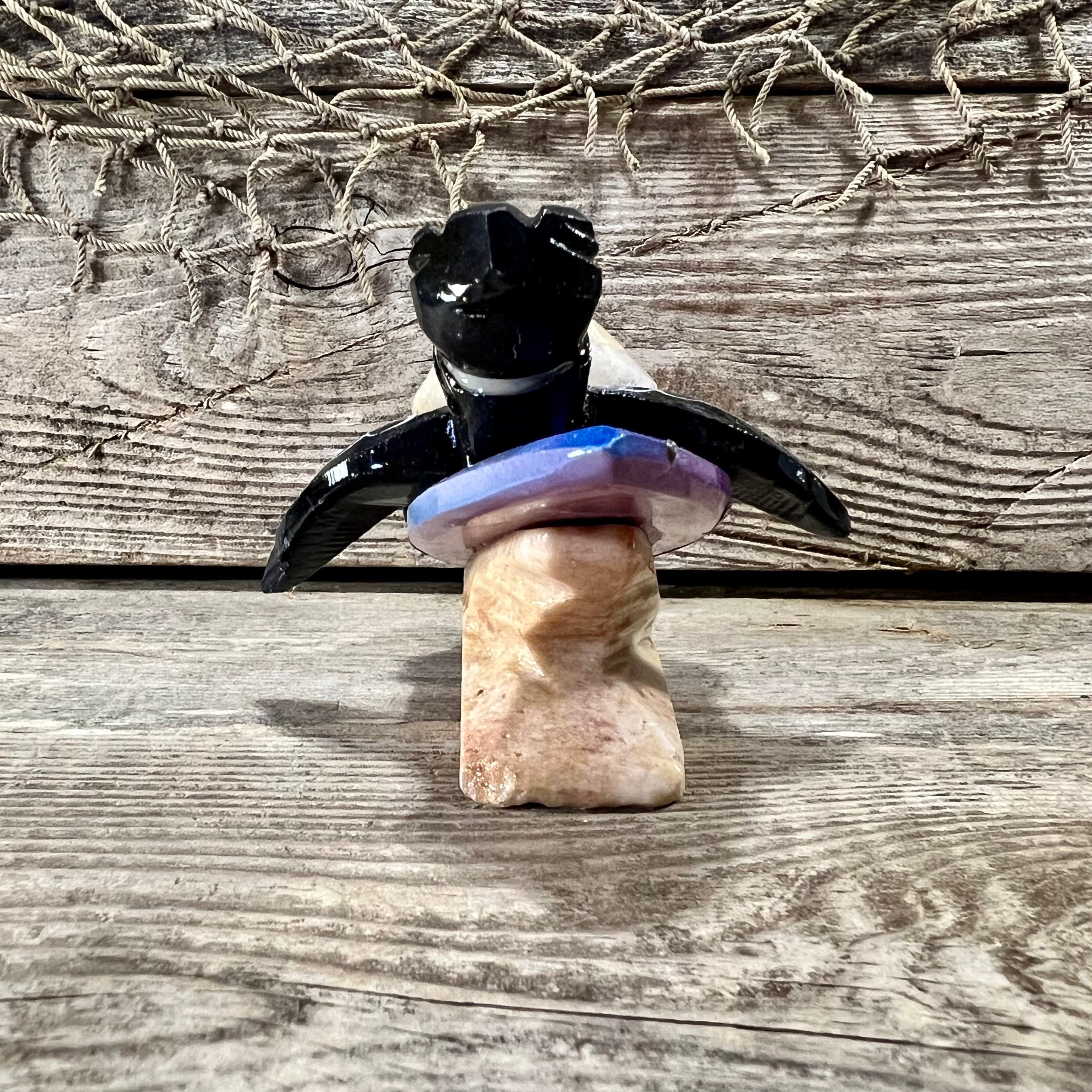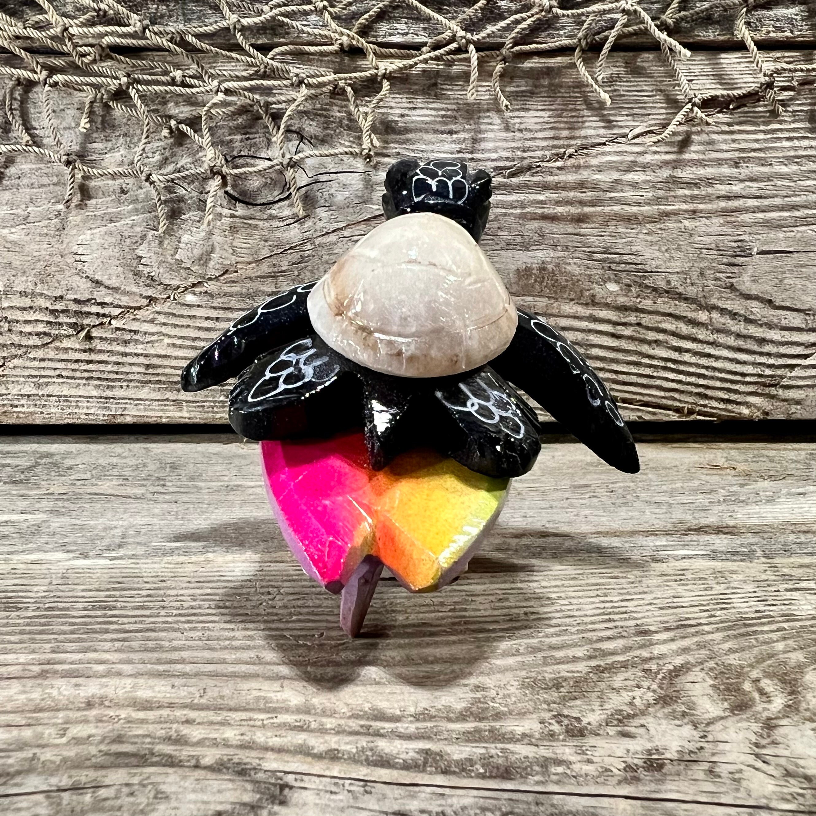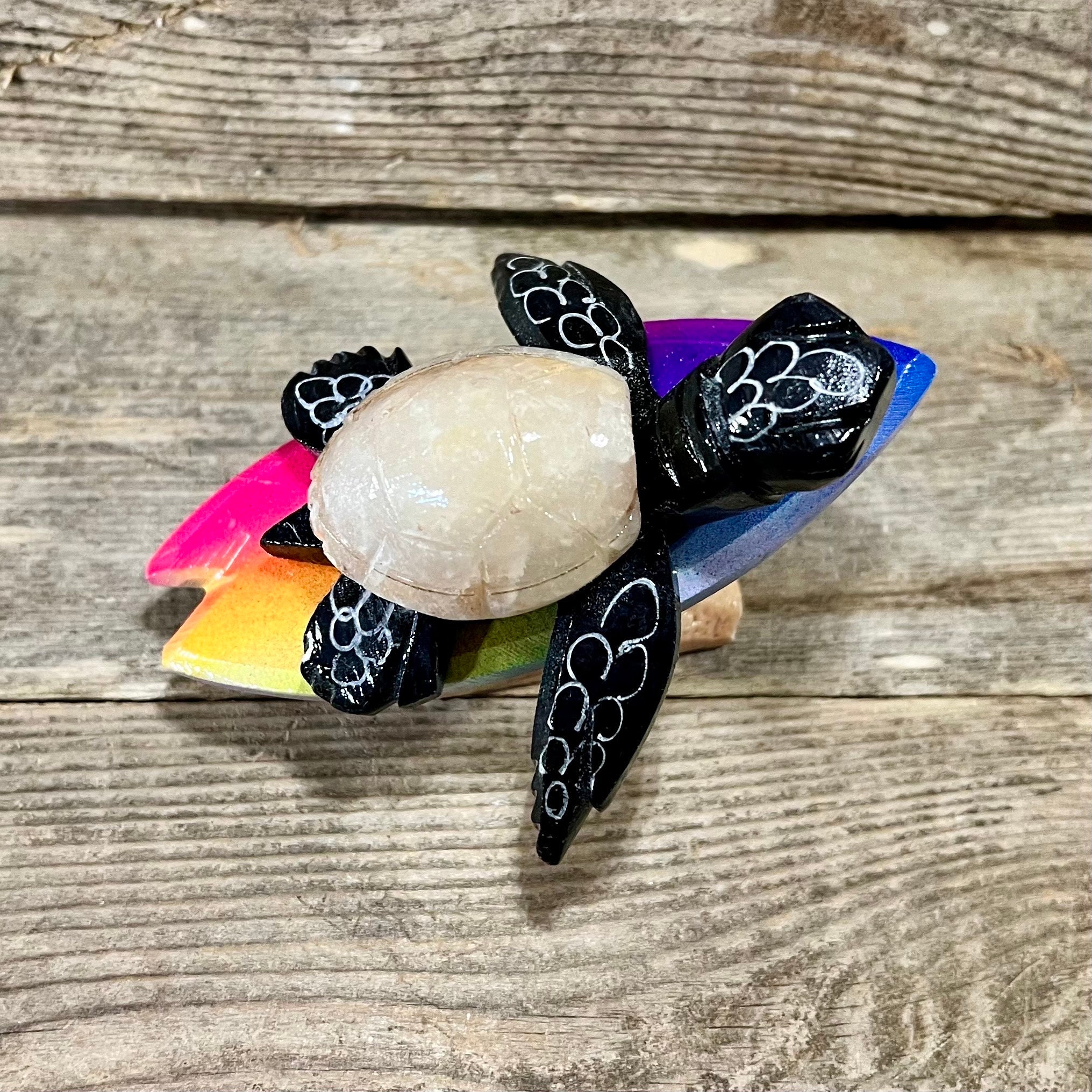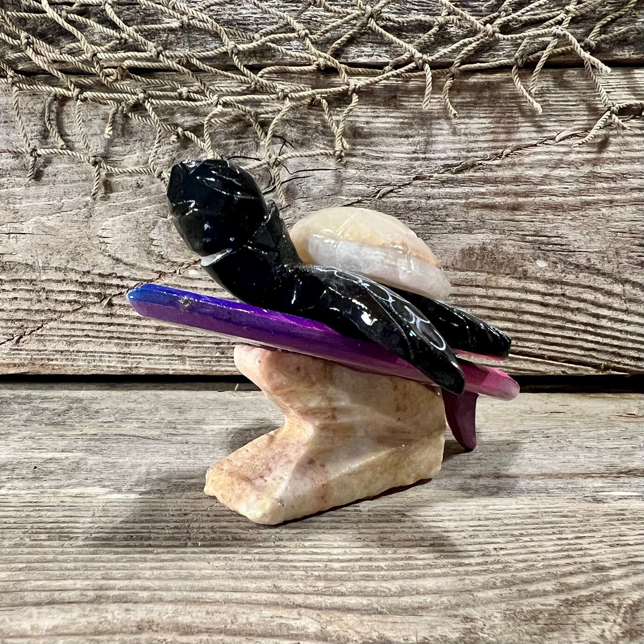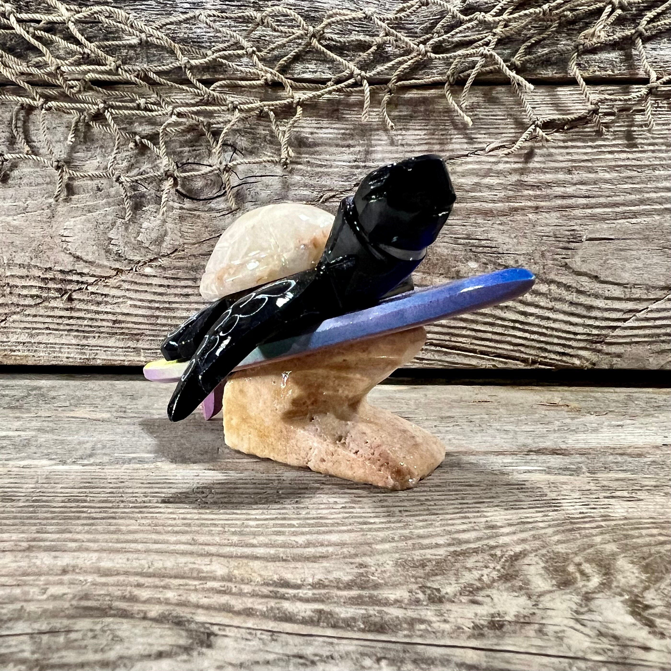 3 3/4” L x 2 1/4” H x 3” W Handcrafted Marble Surfing Black Sea Turtle with Beige Shell Riding Rainbow Surfboard Tabletop Figurine