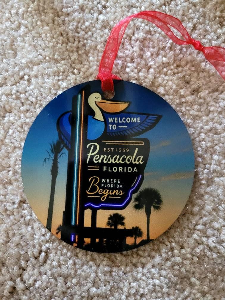 Featuring original artwork of the iconic welcome sign glowing at sunset, this round metal ornament captures the coastal charm and hometown pride of Pensacola. It’s perfect for beach lovers, locals, and anyone who loves the Gulf Coast vibe.